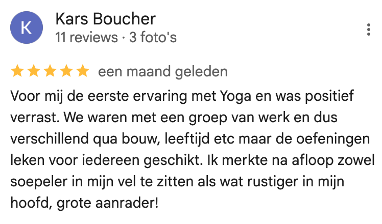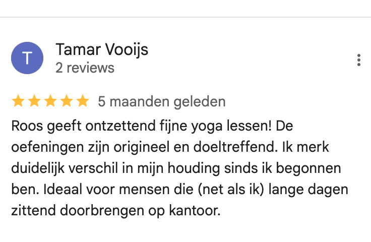Inmiddels geef ik les in yogastudio’s én bij bedrijven, vooral aan mensen die veel zitten en klachten hebben in rug, nek of schouders.